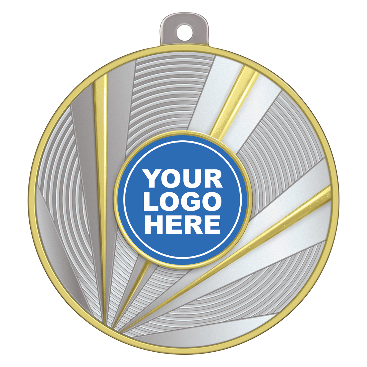 This modern medal features sweeping silver and gold design elements with a prominent central space for a custom logo or standard insert. A versatile option suited to awards at all levels.