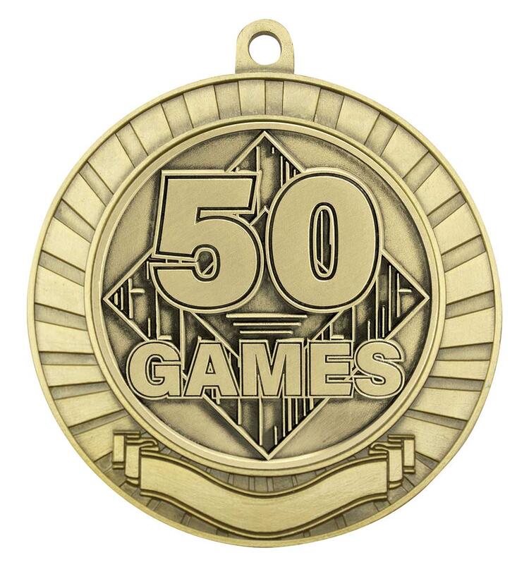Mark a significant sporting milestone with this gold Eco Scroll 50 Games Medal. Precision crafted from durable metal in a classic circular design, it features a ribbon attachment loop and elegant embossed detailing that commemorates 50 games. This standout piece is a trusted choice among sports medals.