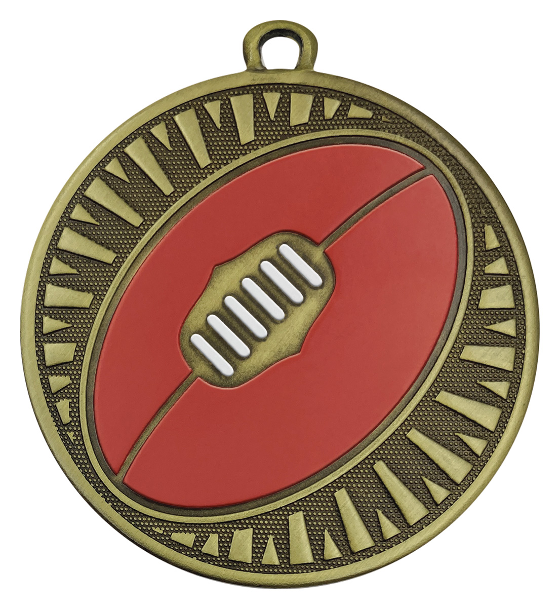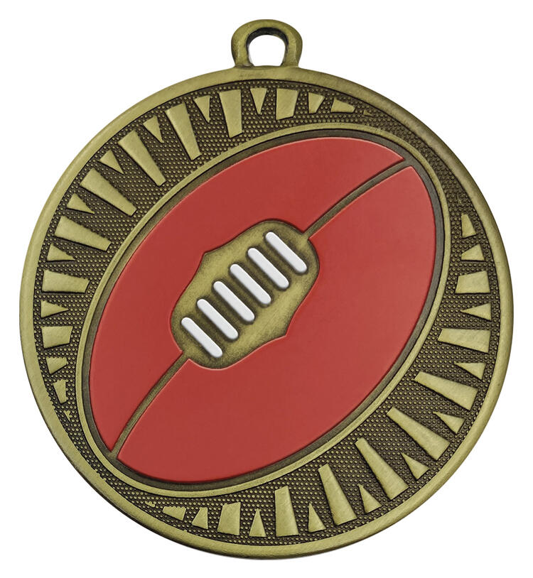 This circular metal medal in gold, red, and white stands out in the aussie rules medals category, crafted for those who value precision and tradition in recognition. A central football motif and textured border create a memorable tribute to achievement on the field.