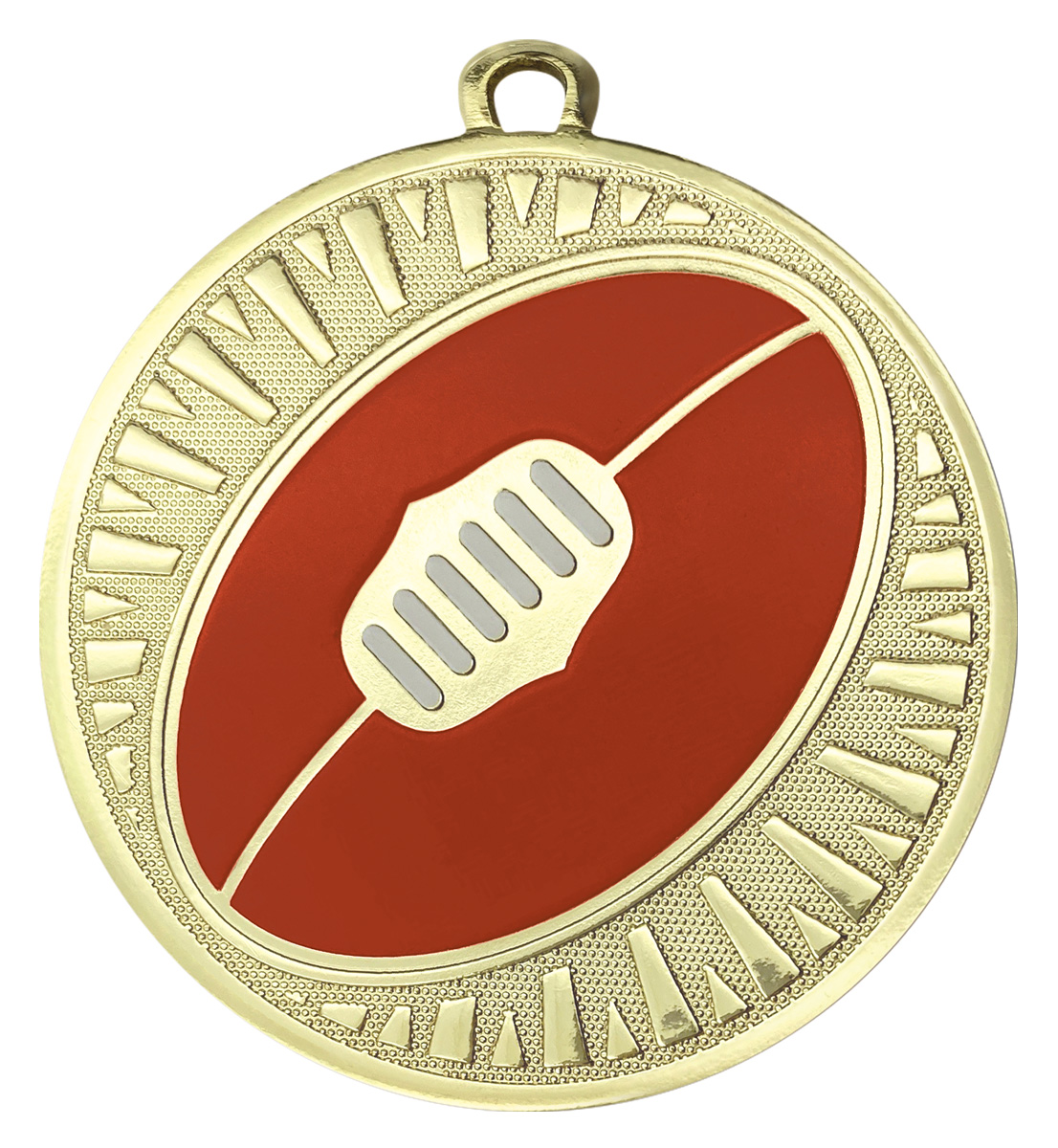 Celebrate Aussie Rules achievement with this standout aussie rules medal, expertly crafted in a durable metal finish and sized at 55mm diameter. Its circular form showcases a gold, red, and white design featuring an iconic football and textured border, available in an Antique Gold Finish.