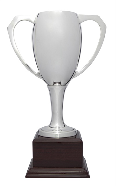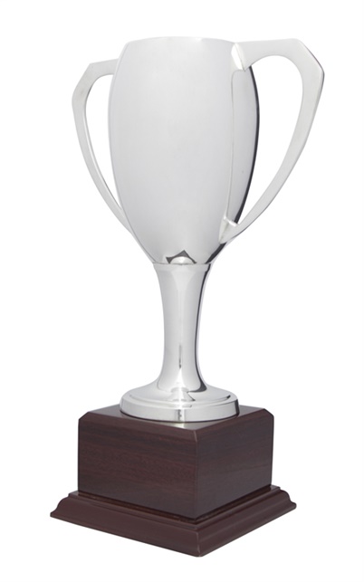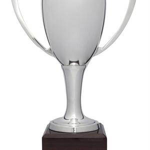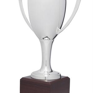 This silver metal cup trophy pairs a refined silver finish with a sturdy brown wooden base, offering a timeless expression of achievement. Its classic silhouette and elegant handles evoke tradition, while the combination of metal and wood underscores durability and lasting recognition.