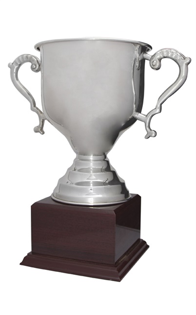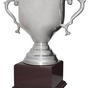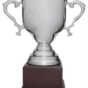 A refined symbol of achievement, this silver metal cup presents a timeless design with its polished finish and classic handles. Resting on a sturdy brown wooden base, it balances contemporary metallic elegance with warm, natural accents. Crafted for versatility.
