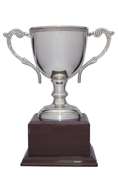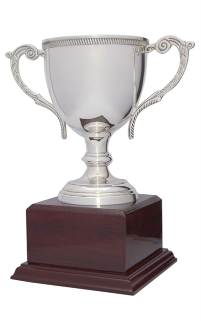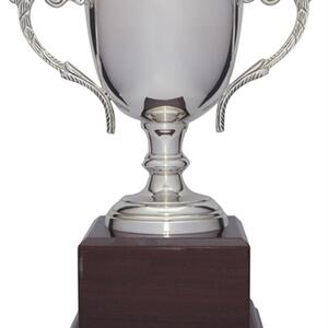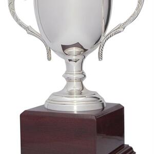 Blending sophistication with strength, this trophy cup features a polished silver metal bowl set atop a rich brown wooden base. Ornate handles add an elegant touch, making it a distinguished choice for recognising achievement across corporate, community, or educational settings.