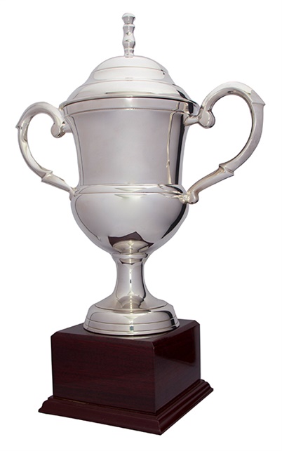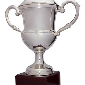 This silver metal cup blends timeless design with contemporary craftsmanship, featuring a polished silver finish and graceful handles for a classic appearance. The addition of a wooden base in rich brown complements the lustrous metal, creating a distinguished and durable piece.