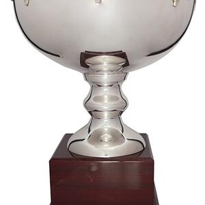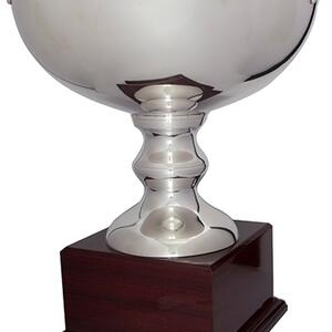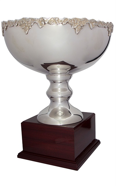 Offering a harmonious blend of silver metal and rich brown wood, this cup trophy is defined by its bowl shaped profile and sturdy pedestal base. The detailed vine-like pattern encircling the rim brings a touch of artistry, while the quality materials provide a lasting impression. This elegant piece is an ideal choice for commemorating achievement with distinction.