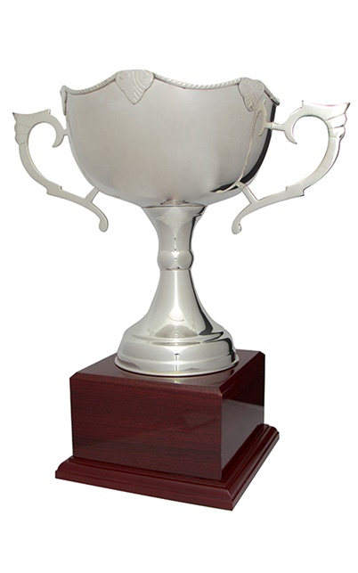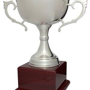 Combining classic design with refined craftsmanship this cup boasts decorative handles and a sculpted rim add an elegant touch, while the lustrous metal contrasts beautifully with the rich brown wooden base. Designed for lasting recognition, it offers a memorable way to celebrate outstanding performance.