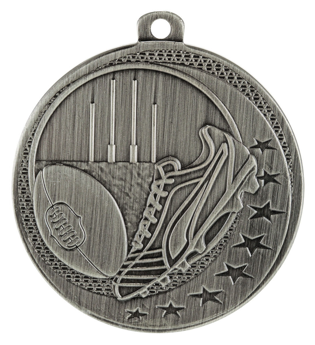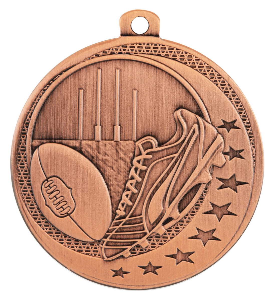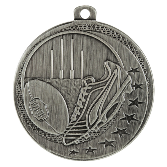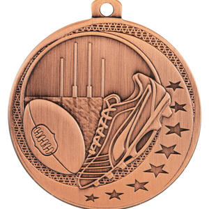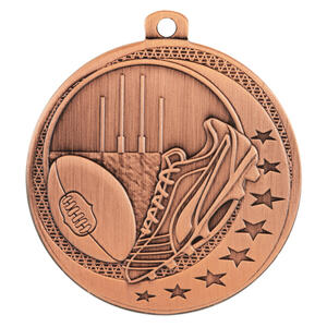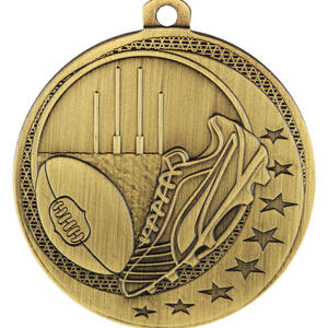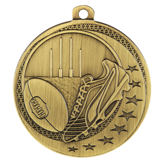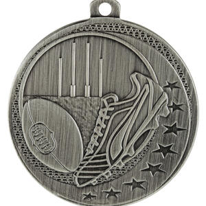 Celebrate sporting achievement with this aussie rules medal, crafted in durable metal and available in gold, silver, and bronze finishes. The 50mm circular design showcases a football, goal posts, and a shoe, highlighted with decorative stars. A practical loop allows for secure ribbon or chain attachment, making it an elegant choice for recognising excellence in Aussie Rules Football.