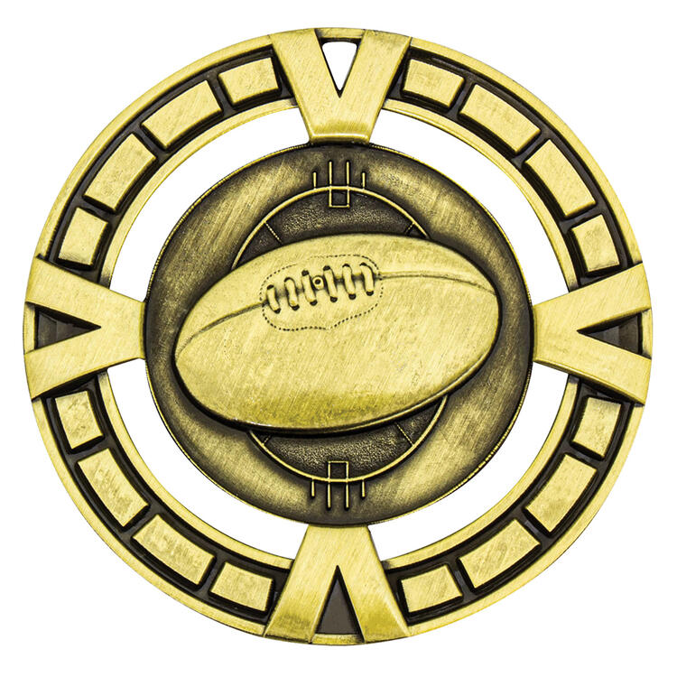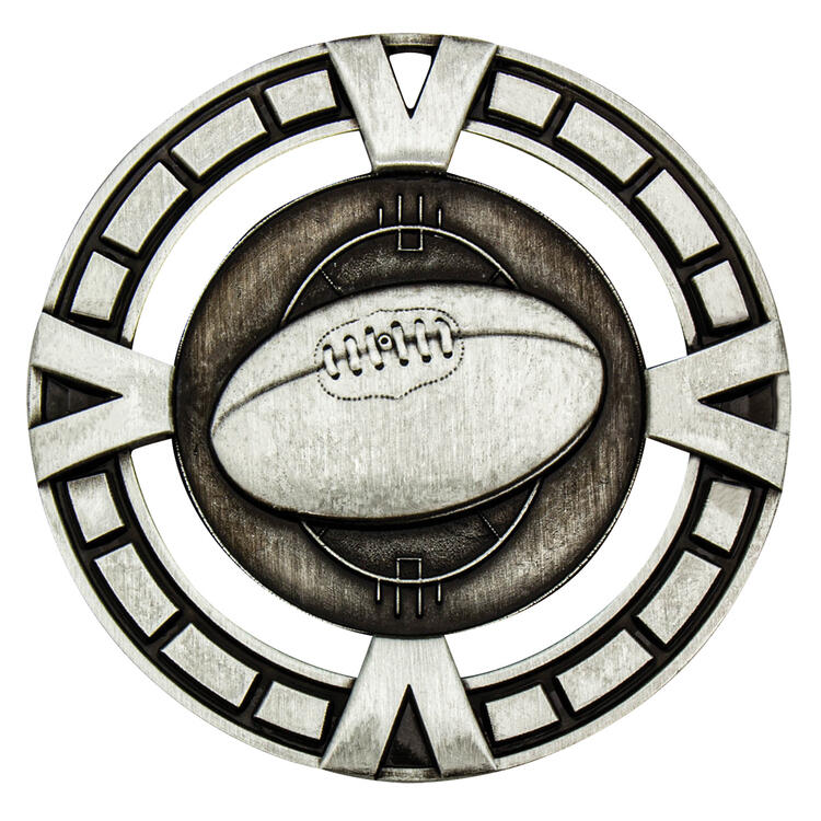 Crafted for distinction, this 65mm metal medal celebrates achievement in Aussie Rules Football with a striking central design of a football and goalposts, encircled by an intricate decorative border. Available in gold, silver, or bronze finishes, it features a unique cut off compass detail and a generous engraving area on the reverse.