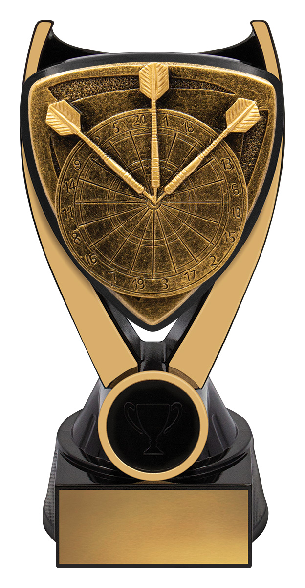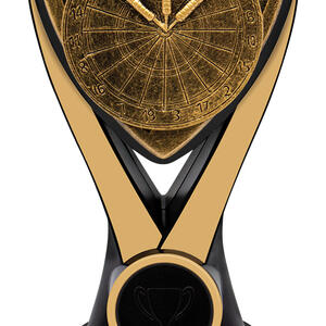 Celebrate achievement in darts with this expertly crafted darts trophy, featuring a dynamic dartboard design and three central darts. The gold and black finish, combined with quality resin construction, creates a professional and lasting impression. A sleek base adds a tailored touch for memorable recognition.