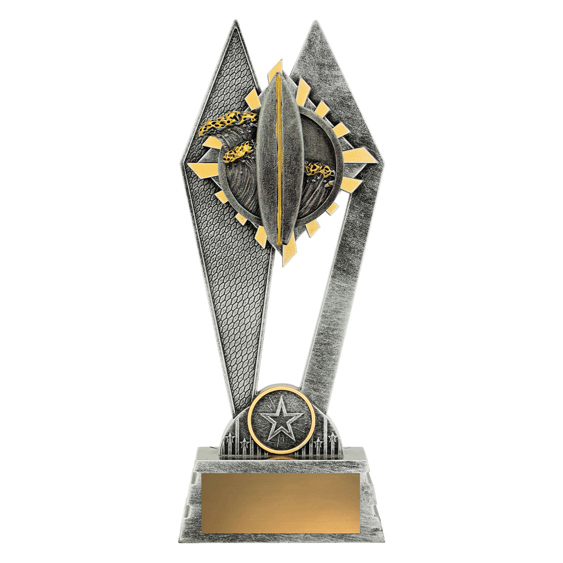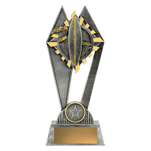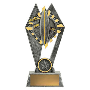 This abstract surfing trophy pairs a bold star emblem with a textured, resin finish for a modern expression of achievement. The central circular element and angular supports create a sense of dynamic movement, making it suitable for celebrating excellence in sporting events. Offered in a silver and gold finish, this award delivers a professional and memorable tribute to outstanding performance.