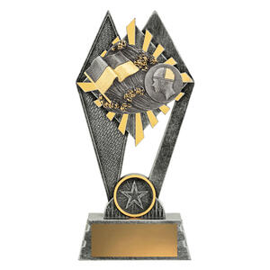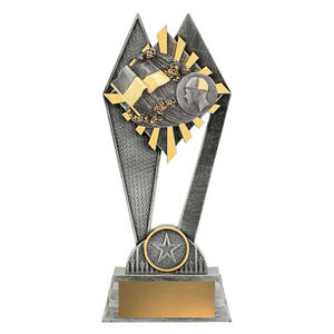 This surf lifesaving trophy presents an abstract geometric silhouette in refined silver and gold tones, embodying a sense of achievement. Featuring a detailed football and helmet motif highlighted by a star emblem at the base, it delivers a memorable and contemporary tribute. Crafted with quality resin, this award offers a distinguished and lasting symbol of recognition.