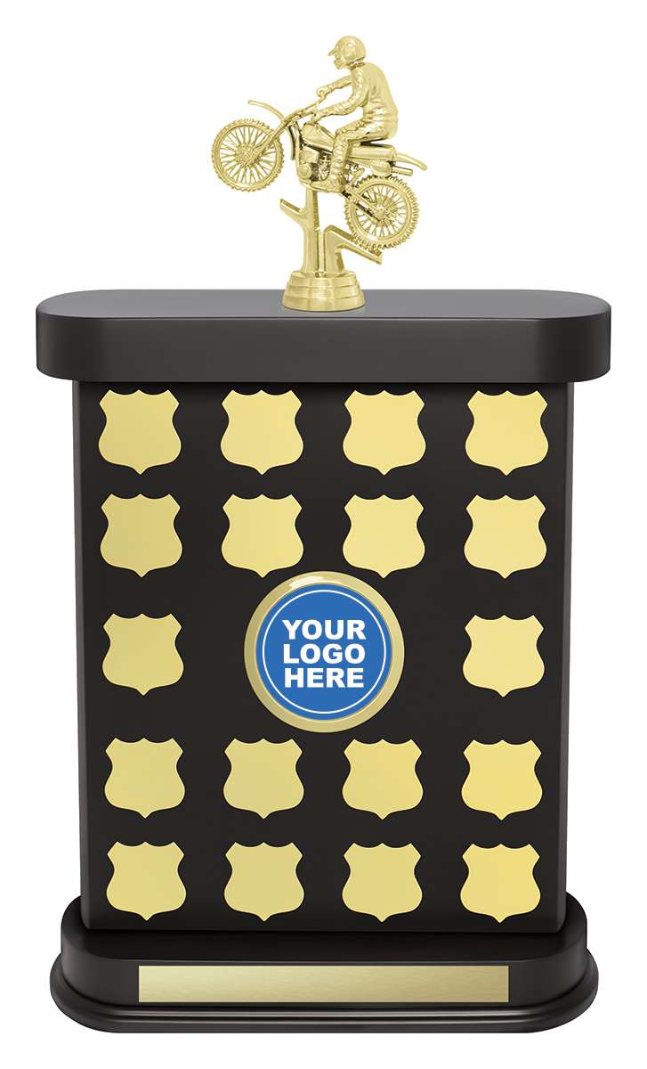 This sports trophy perpetual brings together durability, elegance, and ongoing recognition for motorcycling excellence. Featuring a detailed interchangeable gold plastic figure atop a sleek black rectangular base, it is designed to hold multiple shield shaped plaques for future engraving. A prominent 50mm centre is ready to showcase your clubÂ’s logo or emblem, making every achievement memorable.