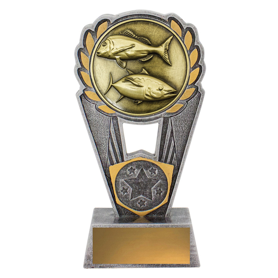 Fishing Achievement Trophy adapts the laurel winged frame to a detailed twin fish centre, making it perfect for angling clubs and fishing comps. Antique silver body with gold trim, star badge on the riser and a broad engraving plate ready for results or sponsor text. Custom logo disc available on request.
