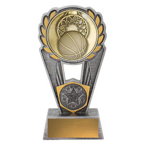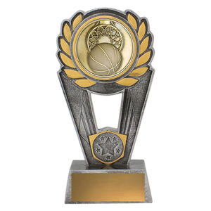 This classic basketball trophy showcases a gold medallion framed by laurel leaves, mounted on a silver resin base. Its elegant form makes it suitable for both male and female player awards, coaches, and team recognition. Includes engraving plate.