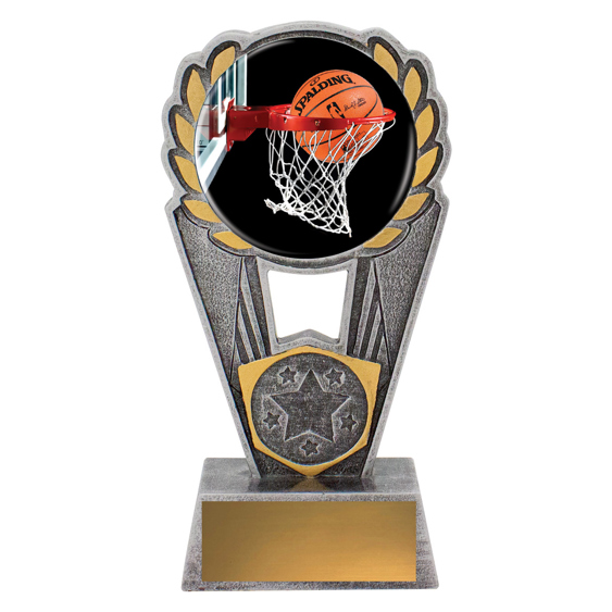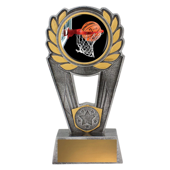 A contemporary printed version of the laurel basketball trophy, featuring a vibrant colour image of a basketball swishing through the hoop. Made from resin with gold highlights and a gold engraving plate for personalisation.