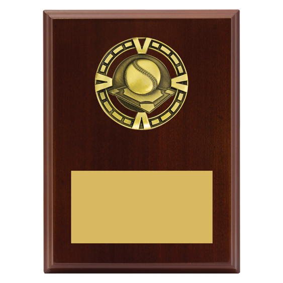 A sleek timber plaque with a round gold baseball emblem featuring a bat and diamond background. Elegant and versatile, perfect for club recognition, coach gifts, or player awards.