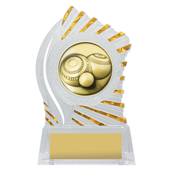 Eye catching clear and gold acrylic lawn bowls trophy with contemporary edge styling. Lightweight yet durable, perfect for modern club events and annual presentations.