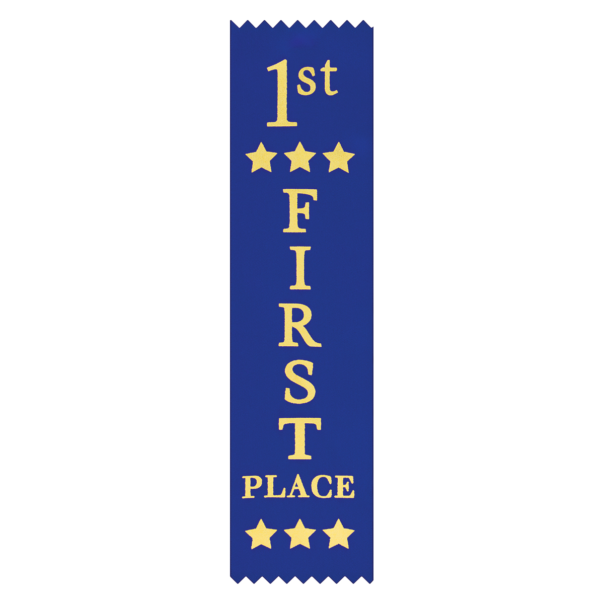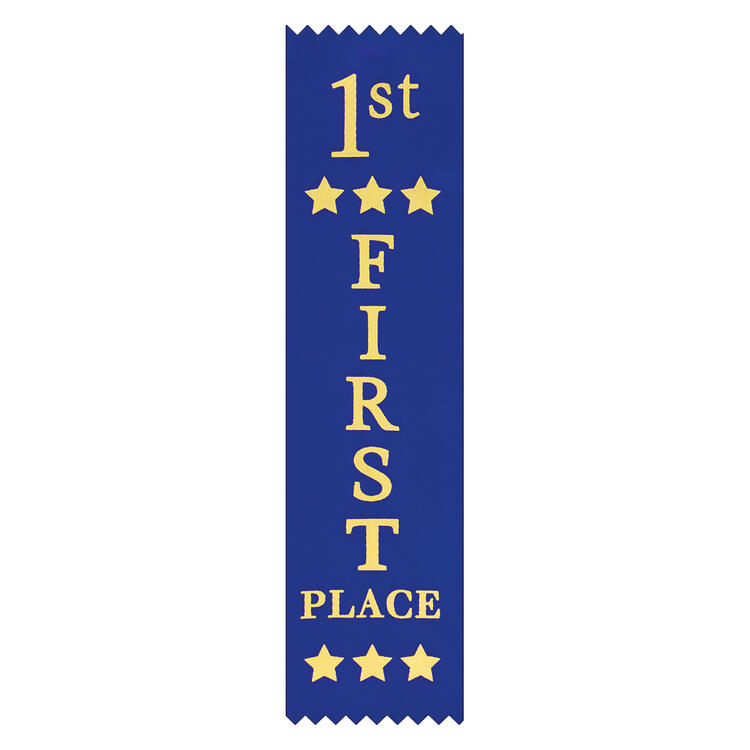 This blue first place ribbon features bold gold foil text and stars, making it ideal for championship winners and top-performing competitors.