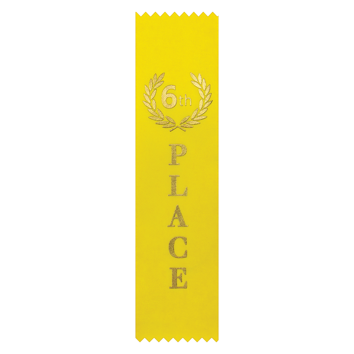 Finished in bright yellow with gold foil lettering, this 6th place ribbon offers a cheerful and professional presentation for events and competitions.