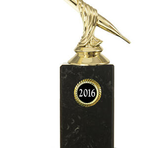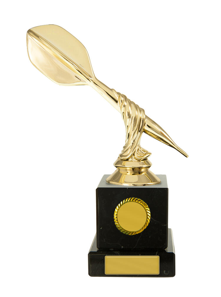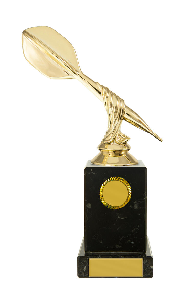 This darts trophy features a gold coloured dart figure set atop a black base, accented by refined gold details. The twisted design adds a modern touch. Ideal for recognising darts achievement, this award offers a distinguished and professional presentation for any event.