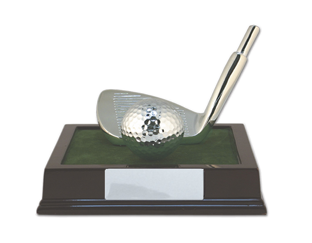 This golf trophy features a striking golf club head and ball, gracefully set atop a timbrt base. Its refined blend of silver, green, and brown tones offers an elegant tribute to golfing excellence. Crafted from quality materials, this award creates a memorable focal point for any presentation or celebration of achievement.