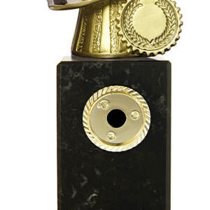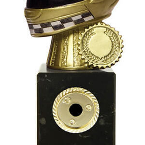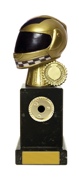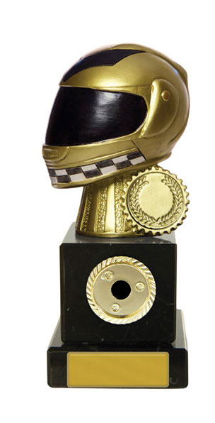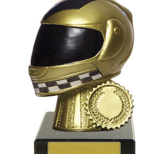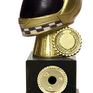 This sports award trophy is crafted for distinction in motor sports. Featuring a detailed 3D golden helmet with a checkered pattern and laurel wreath, it stands out on a sleek black base. The gold and black colour scheme, durable construction, and included customisation option make it a memorable and professional motor sports trophy for any achievement.