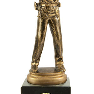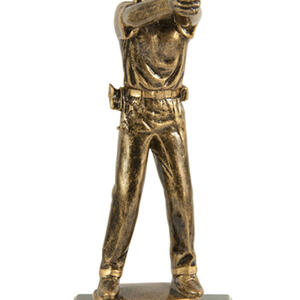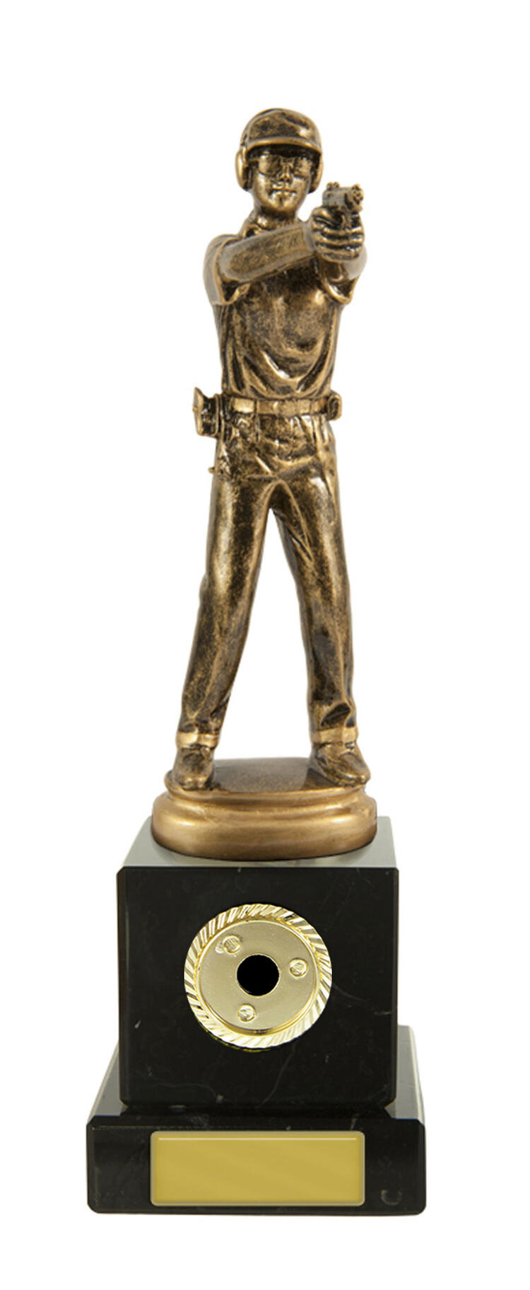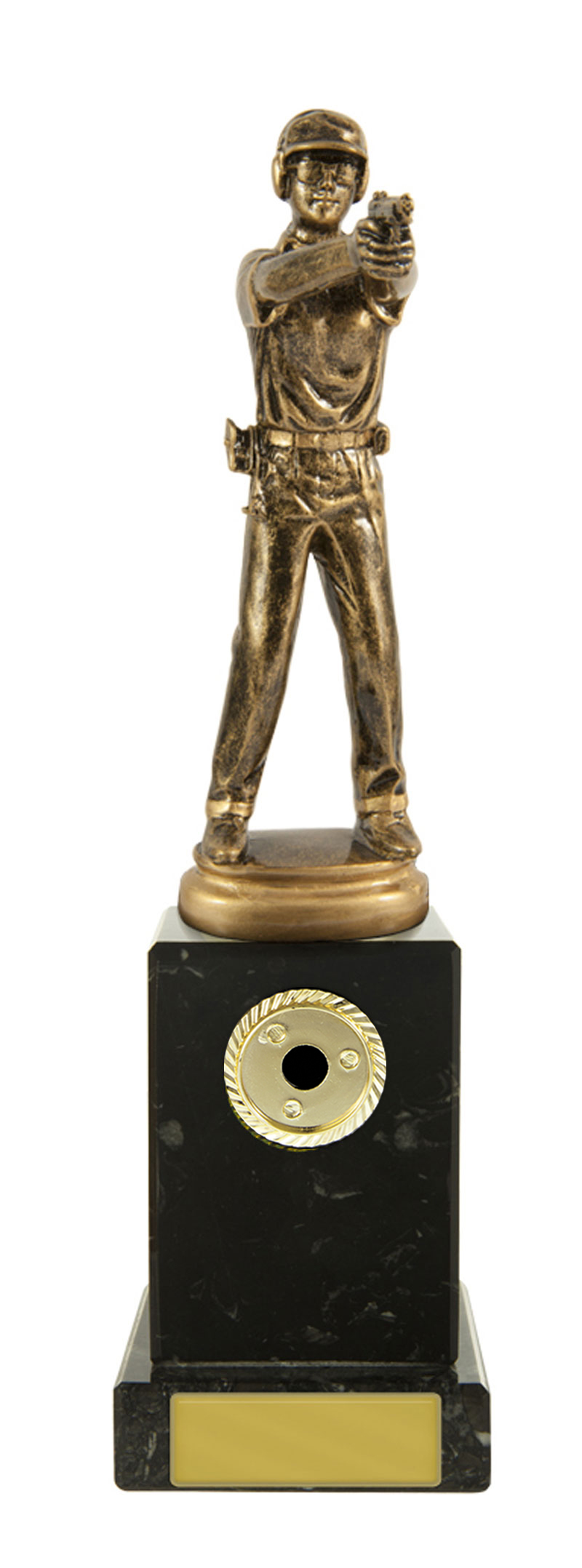 This pistol shooting trophy combines a gold toned figurine with a distinctive black base, offering a refined way to recognise excellence in shooting sports awards. The rectangular, tiered base ensures the piece stands with presence, while the gold plate provides a polished finish.