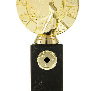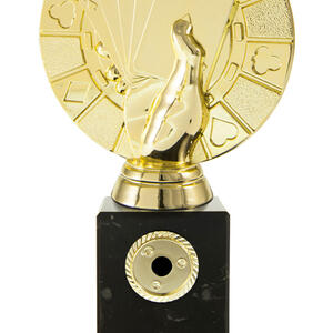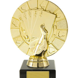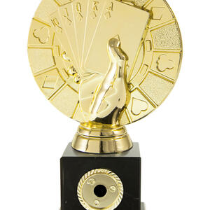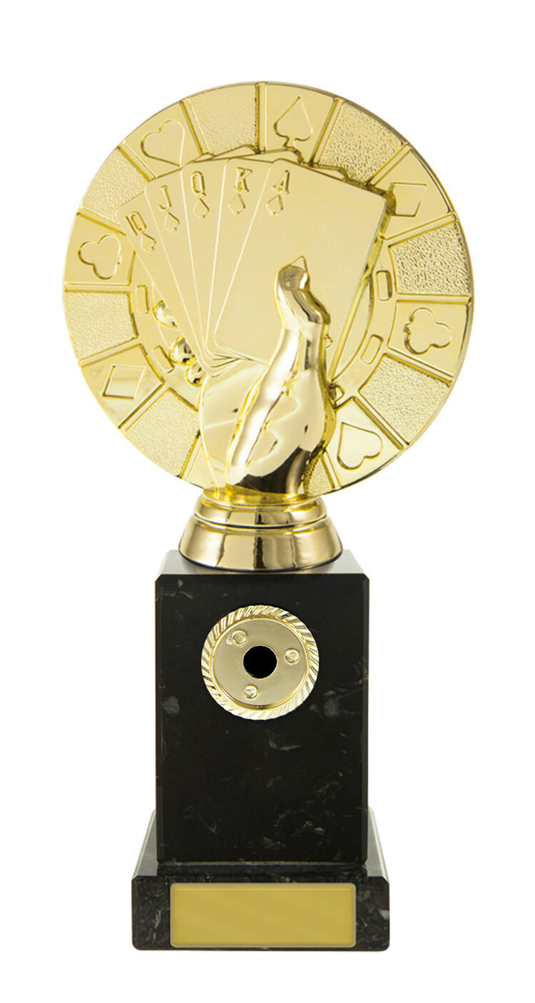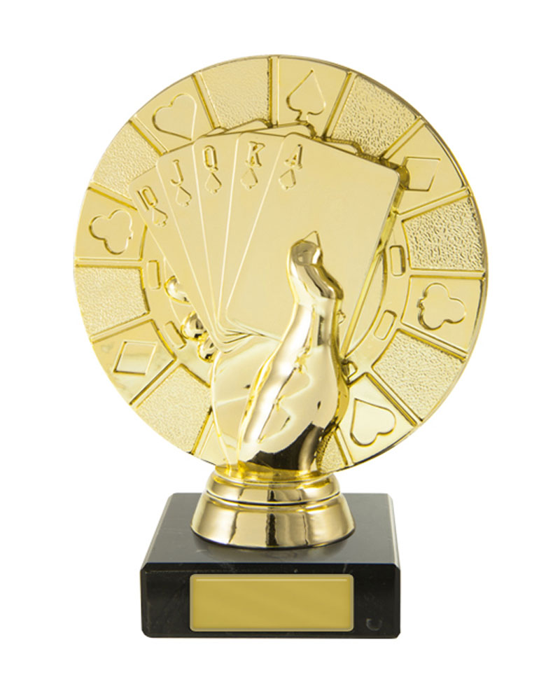 Distinguished by its contemporary design, this cards trophy features a striking hand holding a royal flush atop a rectangular base. The elegant gold and black finish, paired with durable marble and plastic construction, makes it a standout poker award for tournaments and casino events.