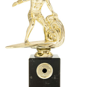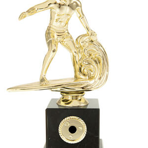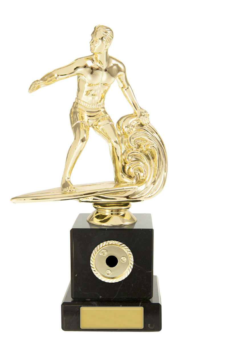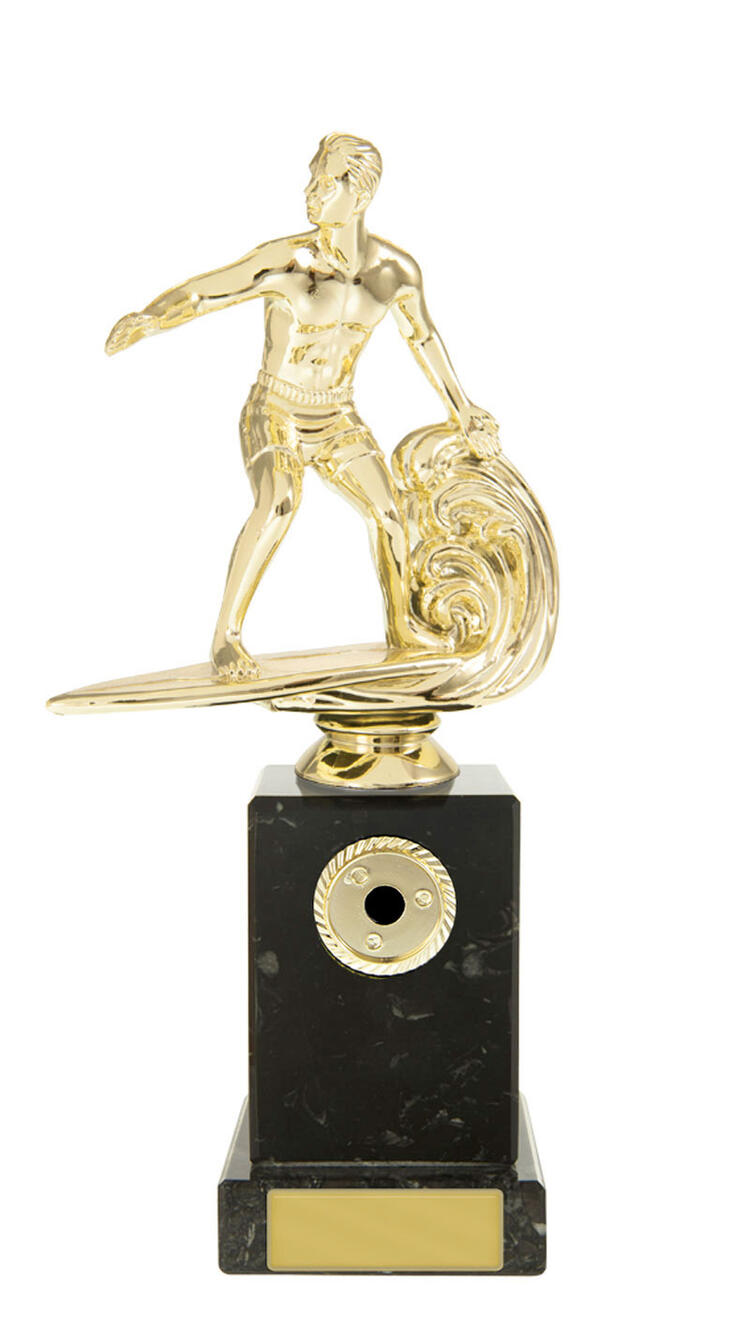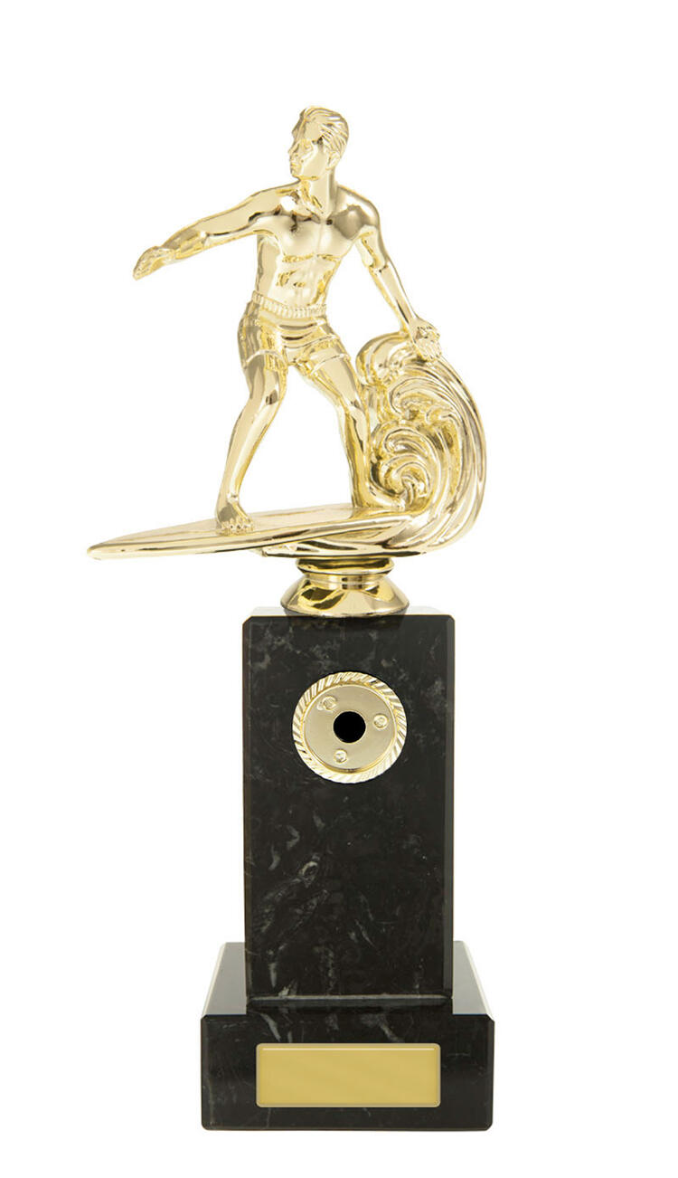 Celebrate surfing achievement with this crafted surf trophy, featuring a dynamic gold surfer figurine in mid ride atop a meticulously sculpted wave. Each surfing trophy offers unique character thanks to its individual oxidised finish and comes with a gold plaque for custom recognition.