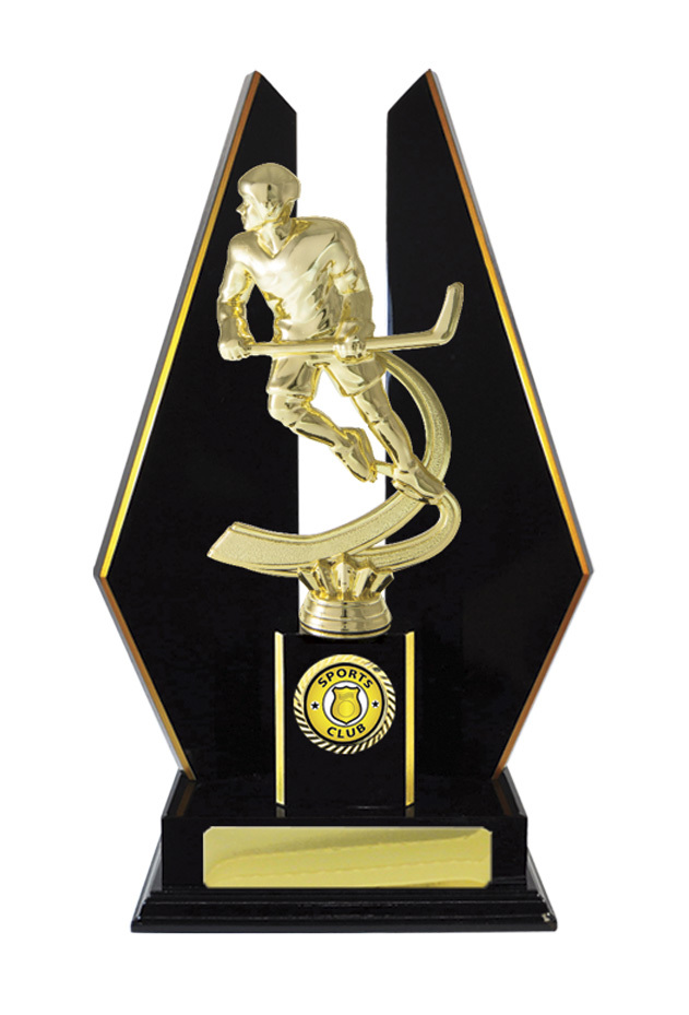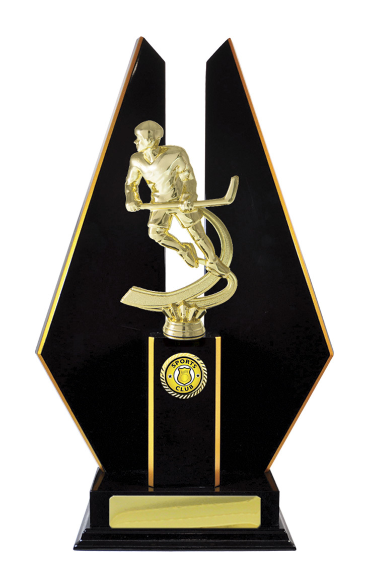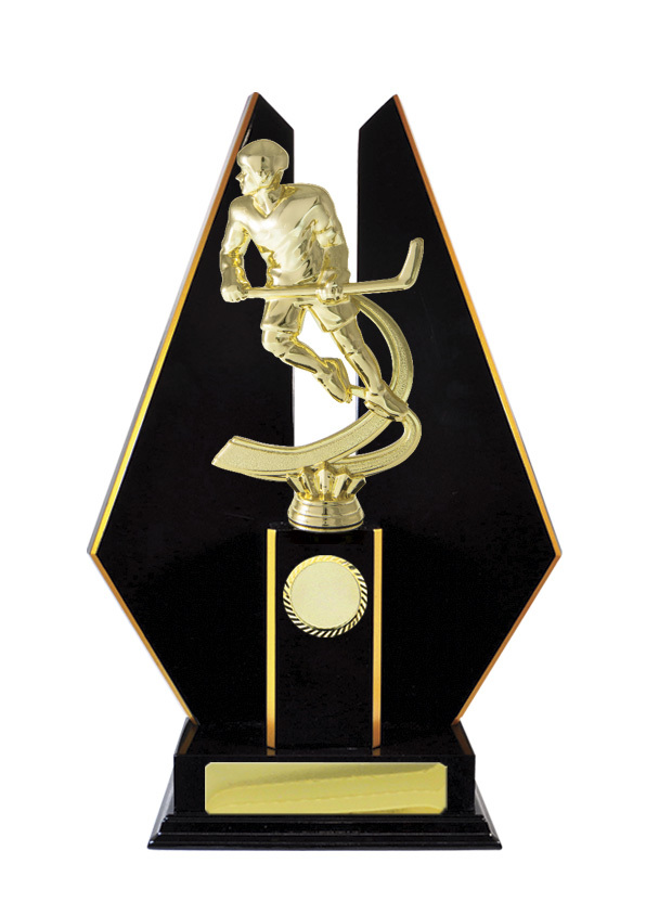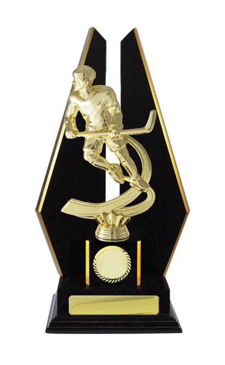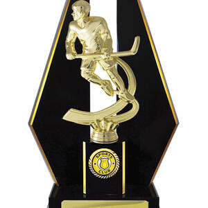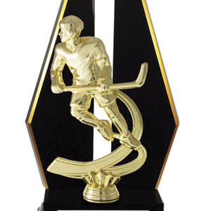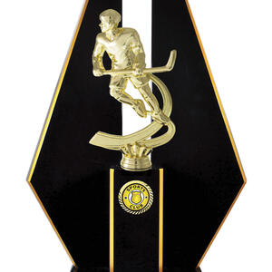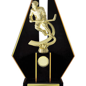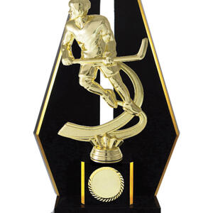 Showcasing a gold coloured hockey player figure poised atop a sleek, angular black base with refined gold accents, this ice hockey trophy brings a sense of achievement and distinction to any awards presentation. It offers a contemporary design to suit individual honours or use as a perpetual trophy.