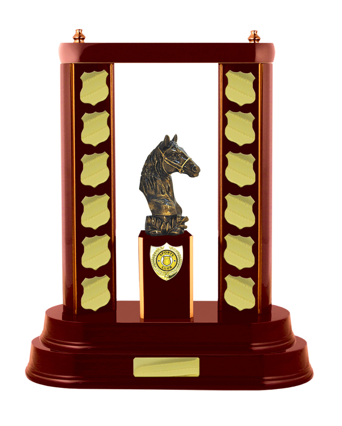 This timber trophy is a distinguished perpetual trophy designed for all sporting achievement. Featuring an interchangable figure, it stands on a solid black wood base. Multiple gold plates offer lasting recognition.