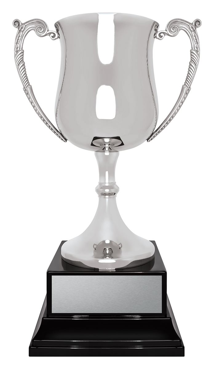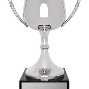 Showcasing a timeless silhouette with elegant handles, this metal trophy cup is finished in reflective silver for a sophisticated look. The durable metal finish ensures both resilience and style. A sturdy plastic black base anchors the design, ready to mark memorable achievements in any sporting arena.