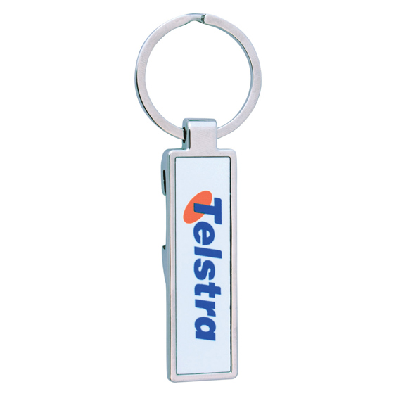 This classic rectangular metal key ring features a polished finish and a printed insert for your logo or design. Its slim, modern profile makes it a practical and stylish promotional accessory for businesses or events.