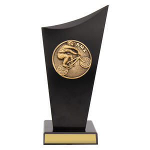 Silver and gold resin BMX trophy featuring a large circular rider image framed by laurel leaves and stars. A strong, bold award for BMX champions and competition presentations.