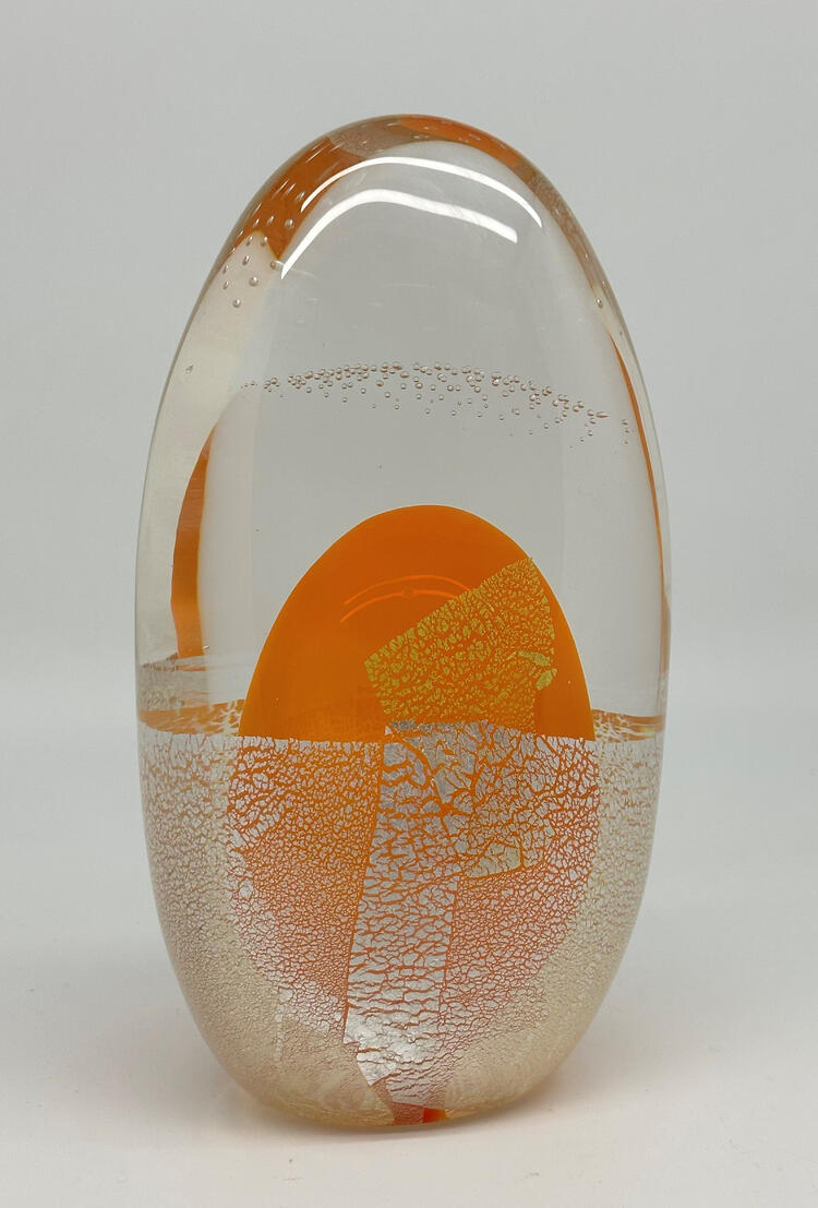 This striking glass artwork by renowned Australian artist Brian Hirst showcases his mastery of form, colour, and light. Handcrafted with precision, the piece features a bold red core accented by intricate gold leaf textures, encased in a smooth, clear glass oval form.