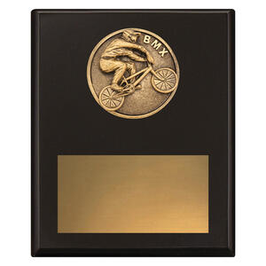Antique gold and silver BMX trophy featuring a circular biker emblem surrounded by laurel and star details. Crafted from durable resin, this versatile design suits all levels of BMX recognition.
