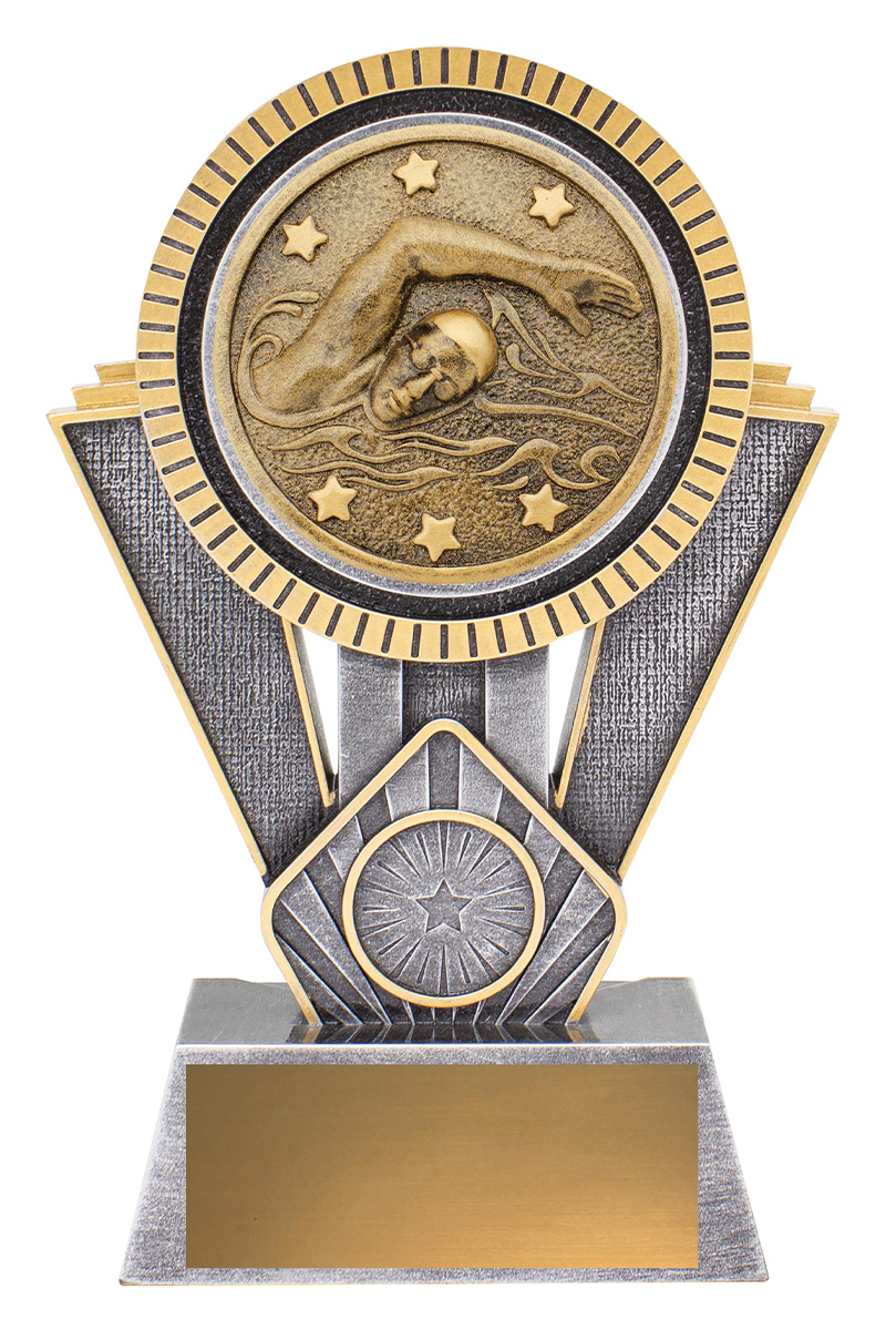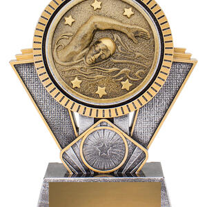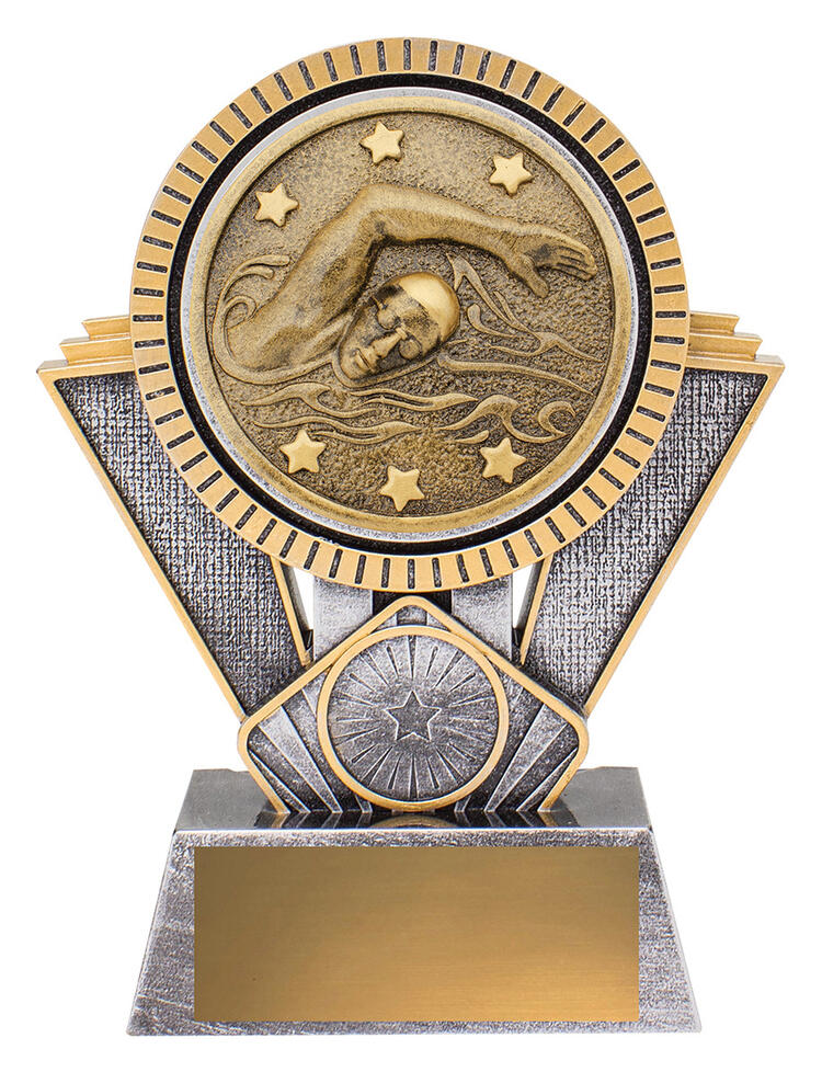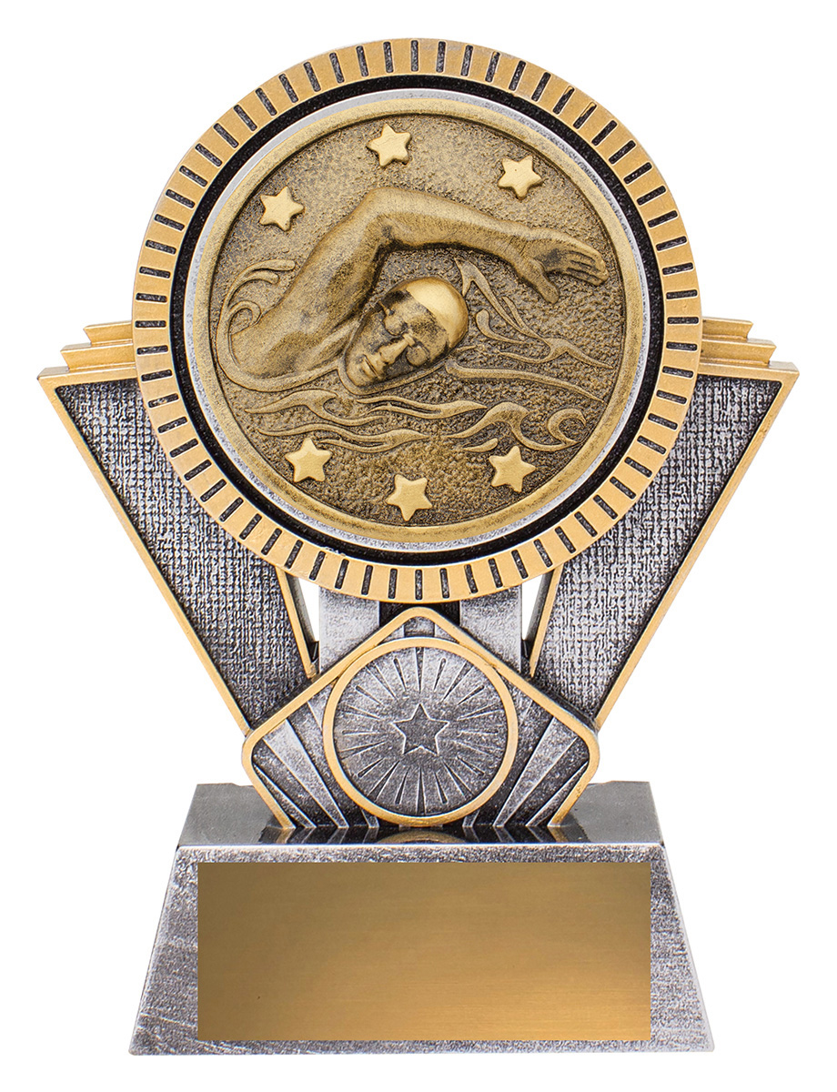Celebrate swimming achievement with a trophy crafted to inspire pride and recognition. Featuring a dynamic swimmer surrounded by star accents, this award combines gold and silver tones for an elegant, durable finish. The unique circular emblem and sturdy rectangular base make it a standout among swimming trophies, perfect for honouring dedication in the pool.