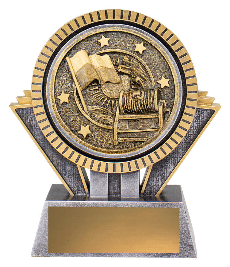 Celebrating achievement in surf lifesaving, this trophy features a robust gold and silver finish with a circular medallion, flag, and wheel design. Crafted from resin, it combines elegance and durability. The rectangular base provides a refined foundation for this surf lifesaving trophy, offering a memorable way to honour excellence in lifesaving events.