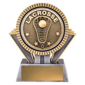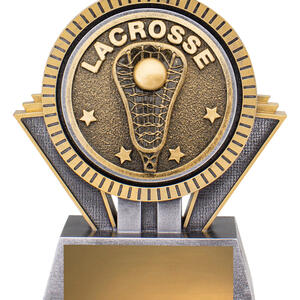 A bold lacrosse trophy featuring a stick and ball within a circular frame. Crafted from quality resin with antique metallic finish, itÂ’s ideal for lacrosse clubs and tournament presentations.