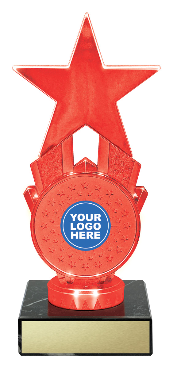 A contemporary choice among dance trophies, this Starling Series award features a striking star design in an elegant red finish. The plastic star frames a circular centre, ready to showcase your chosen logo or emblem, all securely mounted on a classic marble base.