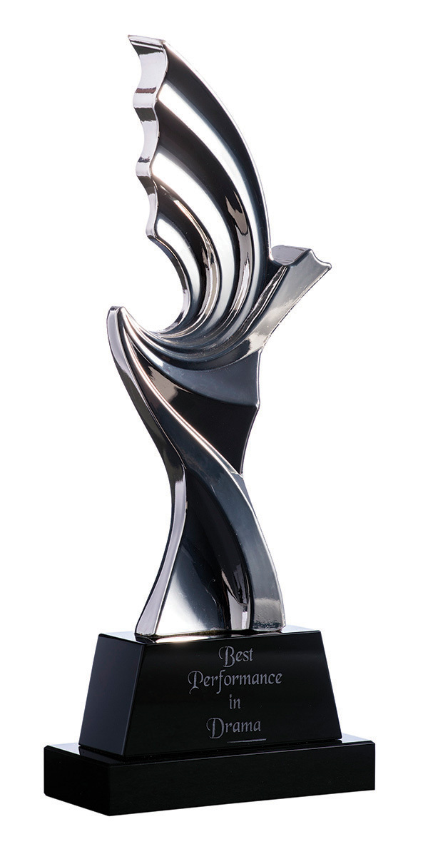 A sculptural silver metal award with sweeping, abstract lines mounted on a black crystal base. The flowing design conveys movement and creativity, ideal for artistic, innovation, or performance recognition.