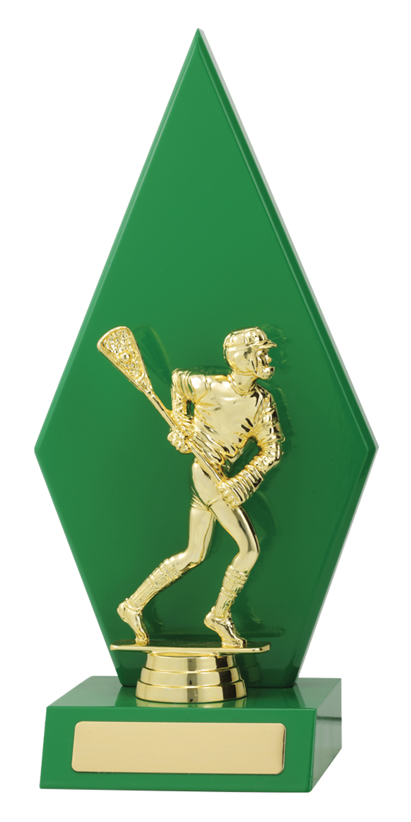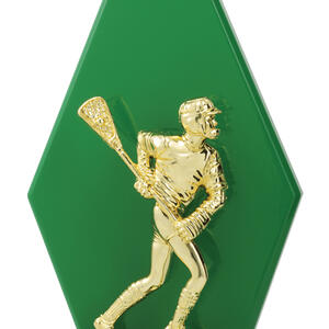 This striking lacrosse trophy features a gold player figure mounted on a bold diamond-shaped green timber backing. A standout award for individual or team performance.