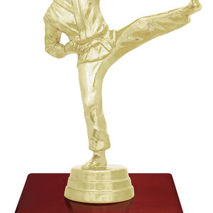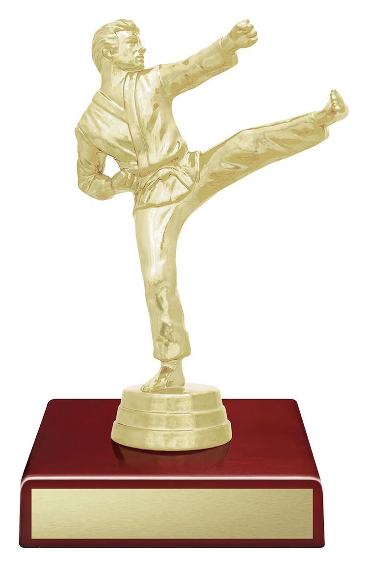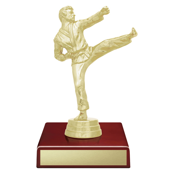 This martial arts trophy features a gold-plated fighter in action pose, mounted on a sleek red timber base. A great choice for dojo gradings, school tournaments, or martial arts clubs.