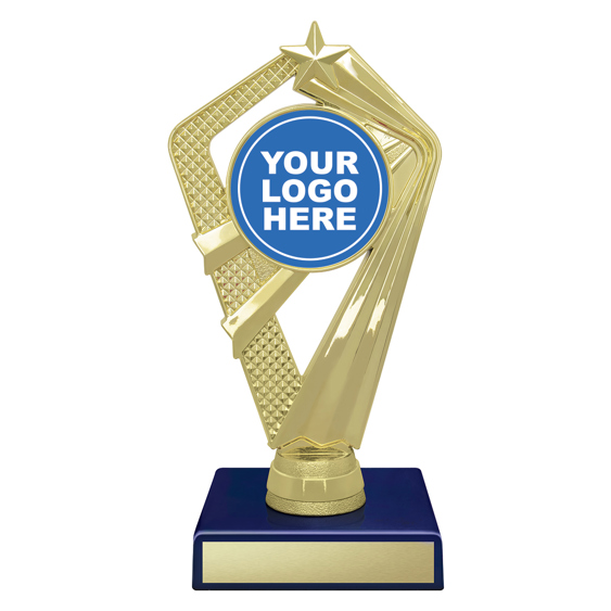 A contemporary blue timber trophy featuring a striking gold star design and custom logo area. This adaptable award suits any sport or event, offering a professional presentation with a timeless finish.
