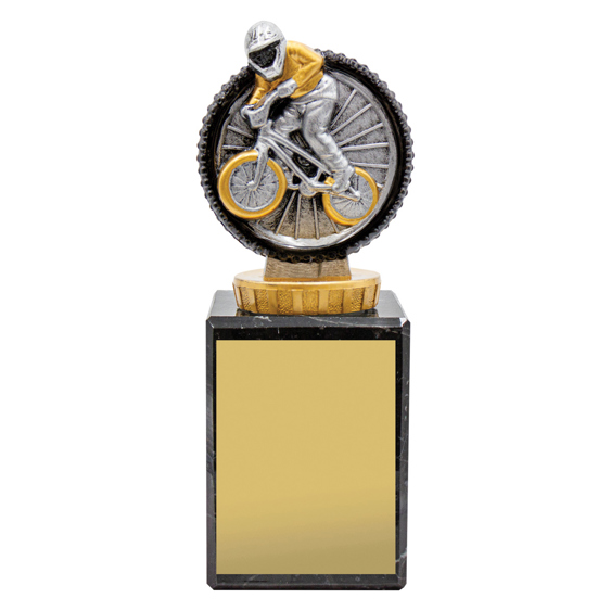 Silver and gold resin BMX trophy with a circular wheel rim frame and detailed 3D rider. Finished with gold highlights and mounted on a black marble base, this compact award celebrates BMX performance with a modern edge.