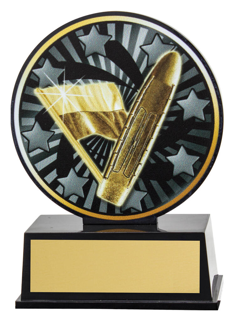 This surf life saving trophy offers a refined blend of gold, black, and silver tones, designed to celebrate achievement in lifesaving with memorable style. Set on a robust rectangular base, it features a circular top adorned with a golden microphone and a flag accented by star patterns. Durable plastic construction ensures lasting recognition for exceptional contributions.