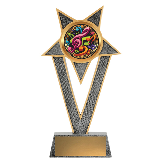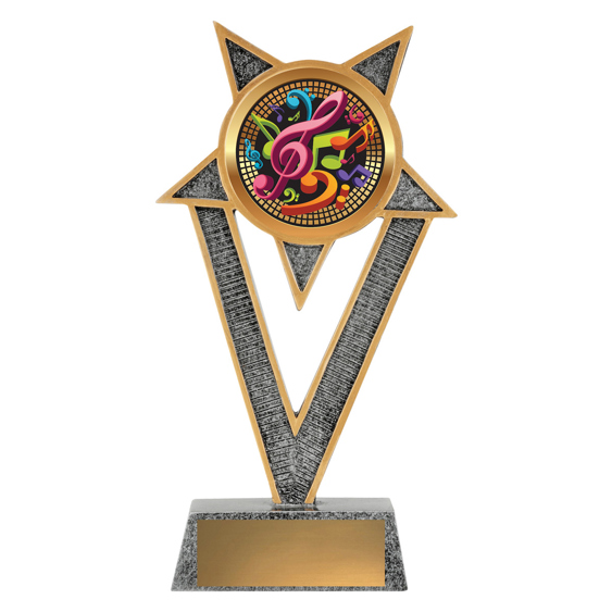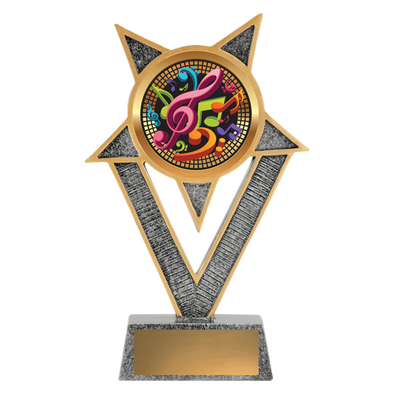 This music trophy features a full-colour treble clef and note motif on a bold V-shaped frame. A fun and modern choice for music competitions, recitals, or school awards.