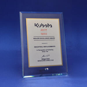 Glass trophies typically have a very slight green tinge, which can subtly affect the appearance of colour printing. In contrast, crystal trophies are completely clear.