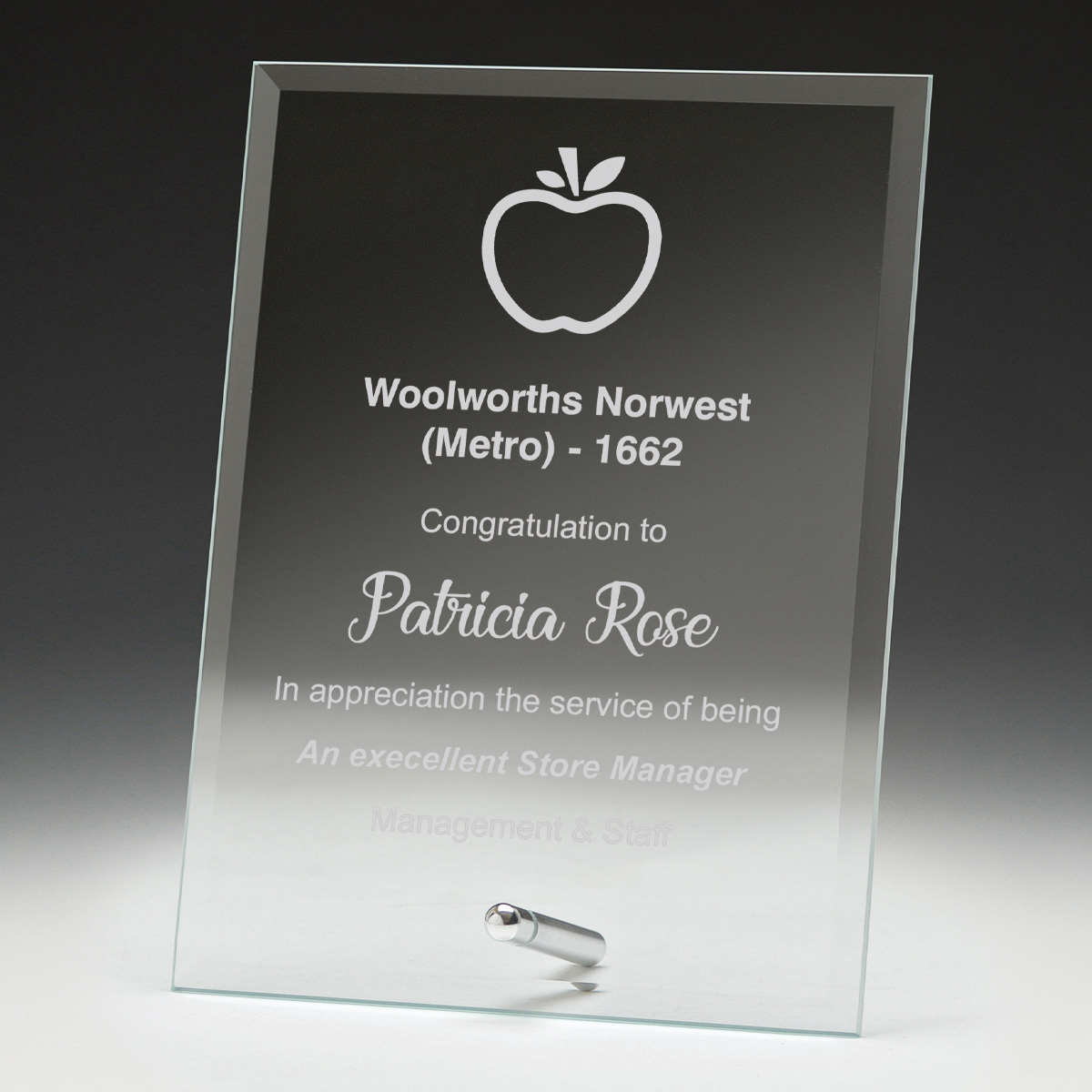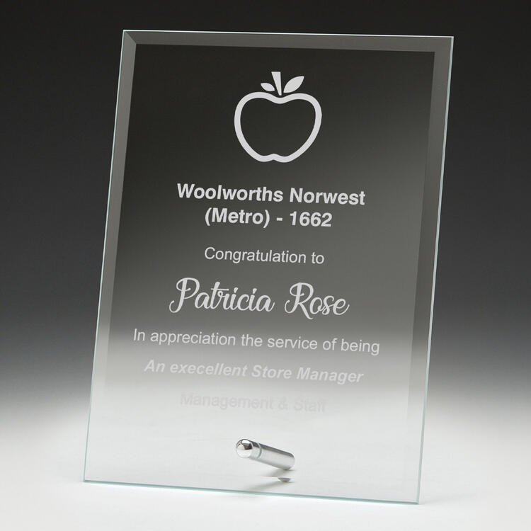 A contemporary addition to any recognition, this rectangular glass award features a clear finish with refined silver accents. The freestanding design, supported by a sleek metal base, offers a professional presentation for celebrating achievement. Available in three sizes, it is a classic choice within the glass awards collection for marking milestones with understated elegance.