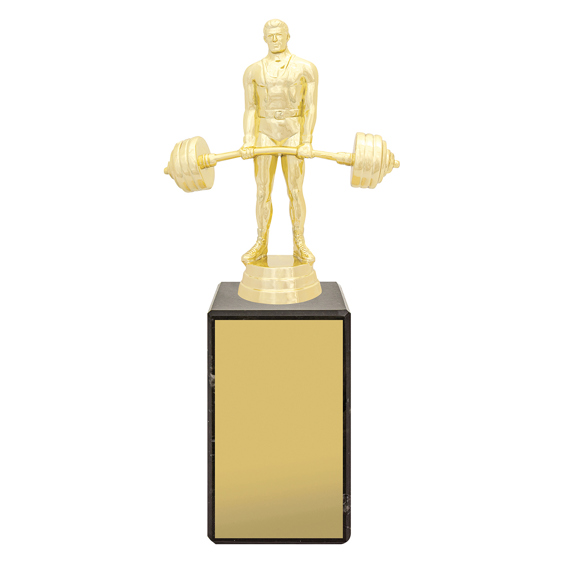 The Weightlifting Marble Column Trophy features a bright gold weightlifter figure mounted on a genuine European marble base. A timeless and elegant choice for strength and fitness awards and club presentations.